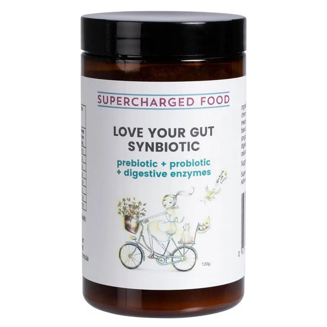 The Supercharged Food Love Your Gut Synbiotic is Unique Formula with Prebiotic, Probiotic and digestive enzymes developed by Clinical Nutritionist.