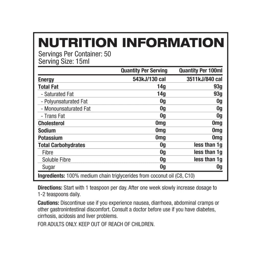 Flavour-free oil for everyday use. Can be taken straight, added to hot drinks, smoothies food and salad dressings. For best results, take as part of a low carbohydrate diet. Cautions: Inappropriate serving size can cause stomach upset. Please follow serving suggestion.