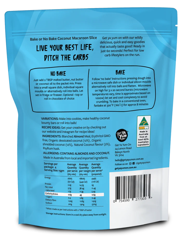 Our portion-controlled coconut macaroon slice can be whipped up in just 60 seconds, and can be eaten raw or baked in the oven either as a slice or rolled into cookies. Makes approx 4 slices or cookies or 4-6 small raw balls.