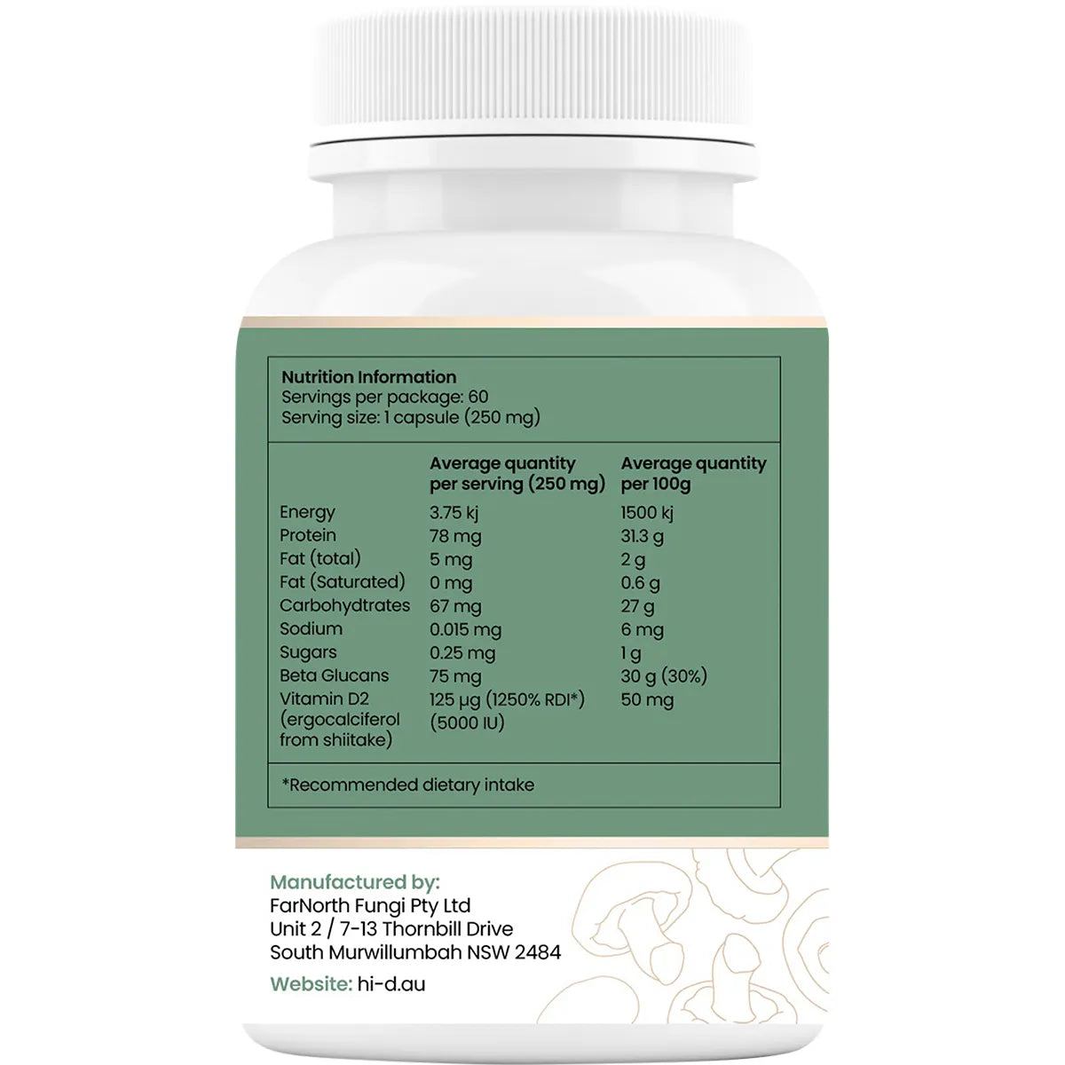 Hi-D is free from gluten, dairy, soy, fish, sugar, chemical extracts, fillers or mycelium