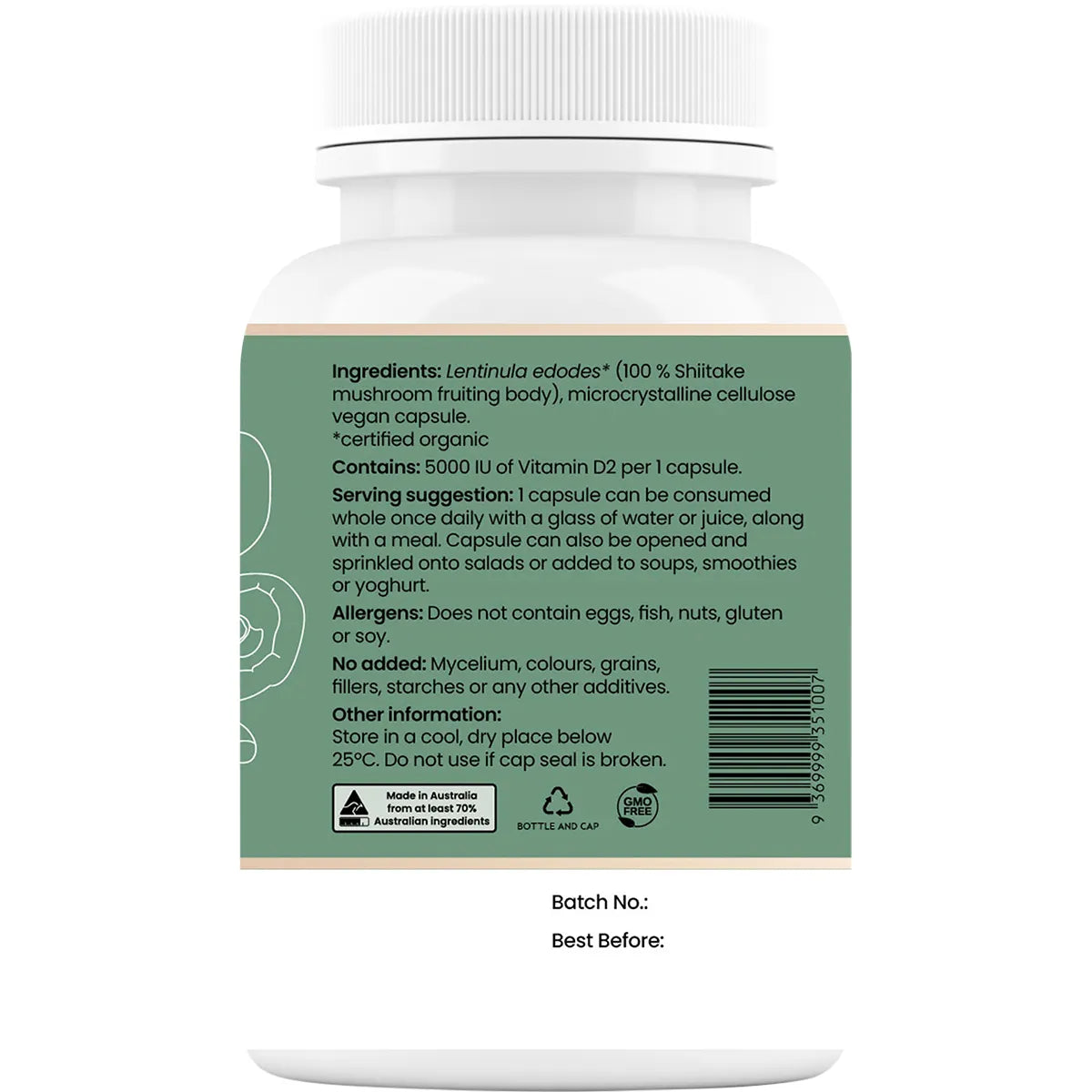 Lentinula Edodes* (100 % Shiitake Mushroom Fruiting Body), Microcrystalline Cellulose Vegan Capsule. *Certified Organic