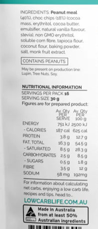 Australian peanut meal (40%), coconut flour, tapioca flour, choc chips (18%) (cocoa mass, erythritol, cocoa butter, emulsifier, natural vanilla flavour, stevia), erythritol, soluble corn fibre, baking powder, salt, monk fruit extract.