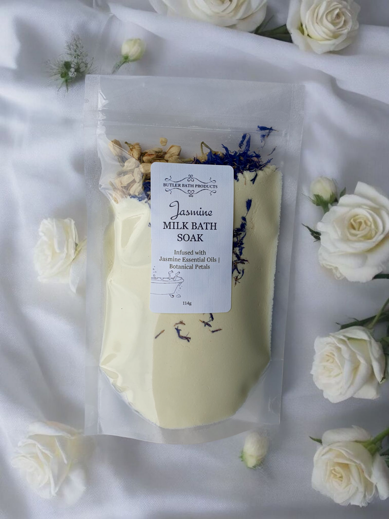 Ingredients: Milk Powder, Bicarbonate Sodium Carbonate, Corn Starch, Aqua, Natrasorb, dried botanicals, essential oil skin grade jasmine buds, calendula petals, cornflower petals.