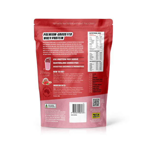 Power up your day with our Australian Whey Protein Strawberry, made from premium grass-fed Whey Protein right here in Australia.