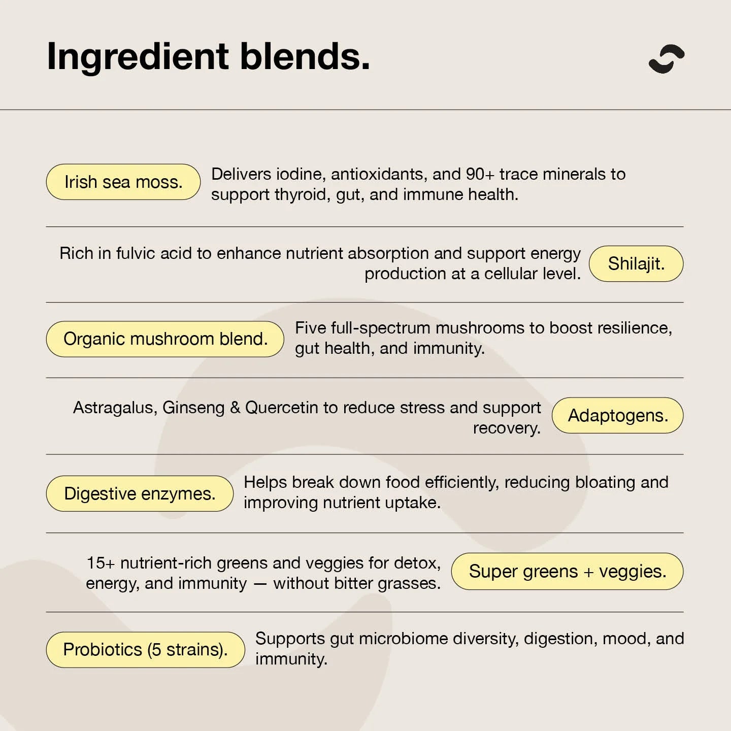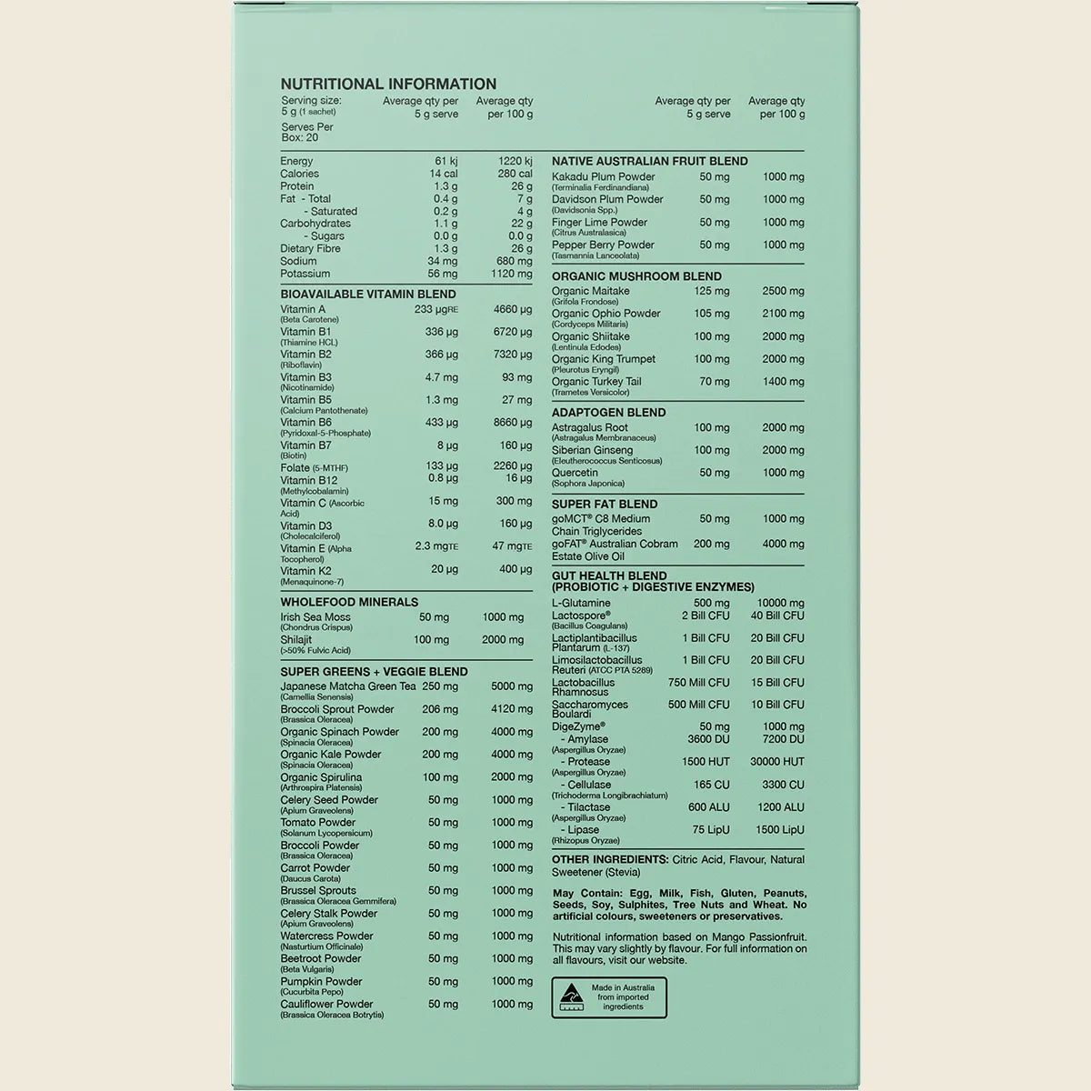 Super Greens & Vege Blend Japanese Matcha Green Tea, Broccoli Sprout Extract, Organic Spinach Powder, Organic Kale Powder, Organic Spirulina, Celery Seed Powder, Tomato Powder, Broccoli Powder, Carrot Powder, Brussels Sprouts Powder, Celery Stalk Powder, Watercress Powder, Beetroot Powder, Pumpkin Powder, Cauliflower Powder, Organic Mushroom Blend (Organic Maitake Mushroom, Organic Cordyceps Militaris, Organic Shiitake Mushroom, Organic King Trumpet Mushroom, Organic Turkey Tail Mushroom), Gut Health Blend L-Glutamine, Digezyme® (Amylase, Protease, Cellulase, Tilactase, Lipase), Lactospore® (Bacillus Coagulans), Lactiplantibacillus Plantarum, Limosilactobacillus Reuteri, Lactobacillus Rhamnosus, Saccharomyces Boulardii), Flavour, Citric Acid, Adaptogen Blend (Astragalus Root, Siberian Ginseng, Quercetin) Super Fat Blend (Gofat® Australian Cobram Estate Olive Oil GoMTC® C8 Medium Chain Triglycerides), Native Australian Fruit Blend (Kakadu Plum Powder, Davidson Plum Powder, Finger Lime Powder, Pepper Berry Powder), Bioavailable Vitamin Blend (Vitamin C (Ascorbic Acid), Vitamin E (Dl-Alpha Tocopherol), Vitamin B3 (Niacinamide), Vitamin B5 (Pantothenic Acid), Vitamin B6 (Pyridoxal 5-Phosphate), Vitamin B2 (Riboflavin), Vitamin B1 (Thiamin), Vitamin A (Beta Carotene), Vitamin K2 (Menaquinone-7), Vitamin D3 (Cholecalciferol), Vitamin B7 (Biotin), Folate (5-Mthf), Vitamin B12 (Methyl cobalamin)), Wholefood Mineral Blend (Organic Himalayan Shilajit (=50% Fulvic Acid, Irish Sea Moss), Natural Sweetener (Stevia).
