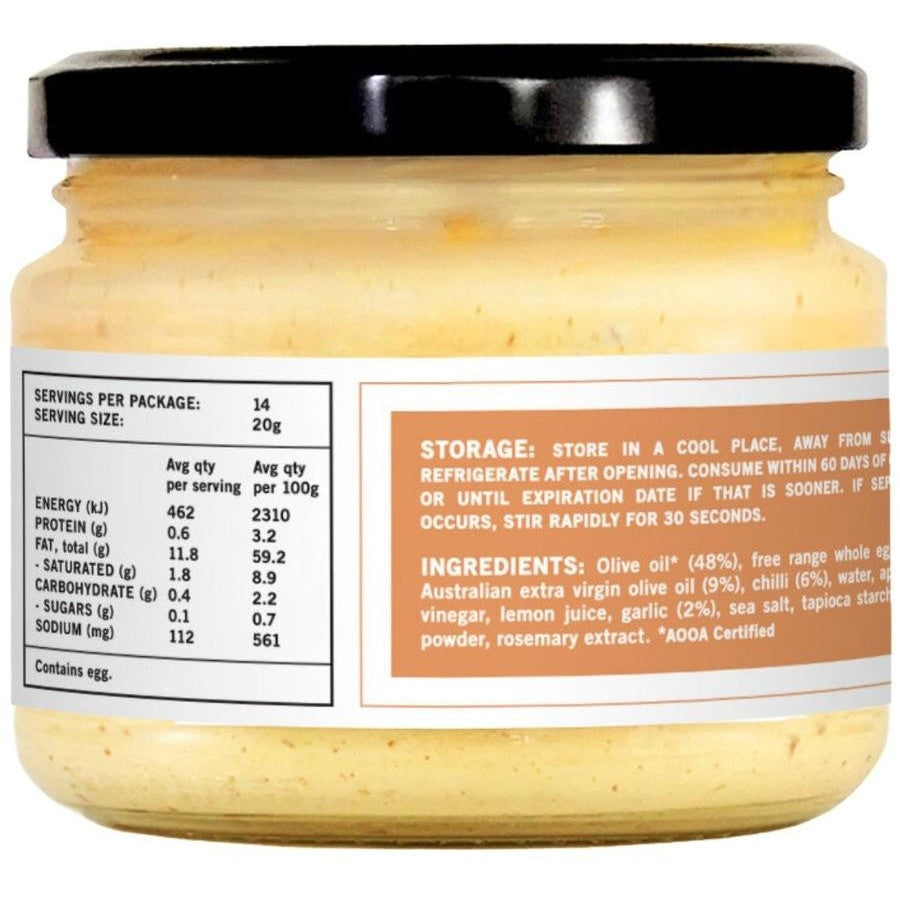 Australian Olive Oil, free range egg, Australian Extra Virgin Olive Oil, chilli, apple cider vinegar, lemon juice, garlic, sea salt, mustard powder, rosemary extract