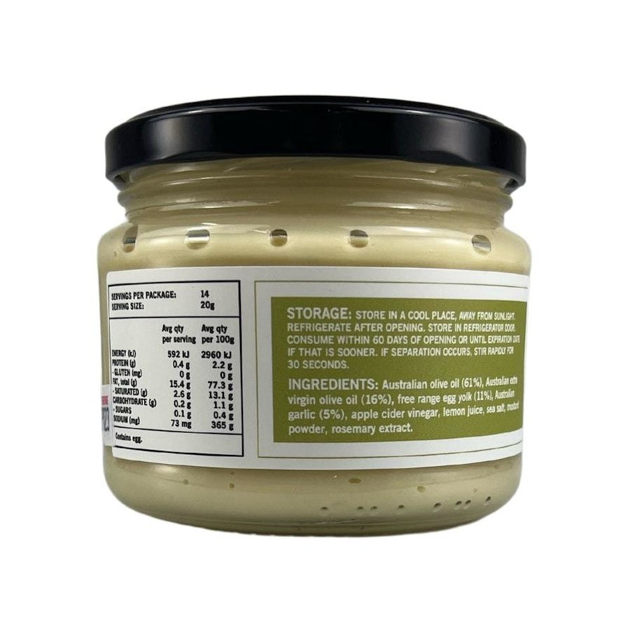Australian Olive Oil, free range egg, Australian Extra Virgin Olive Oil, Australian garlic, water, apple cider vinegar, lemon juice, salt, mustard powder, rosemary extract.